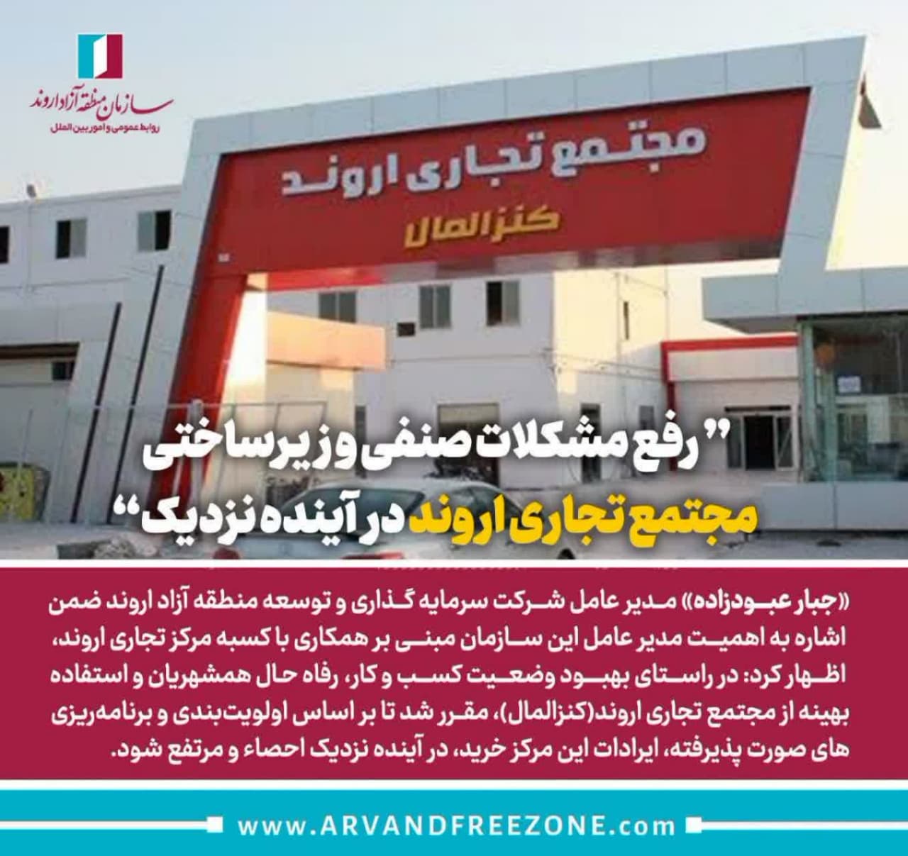 وی با بیان اینکه مجتمع تجاری اروند ( کنزالمال) یکی از برندهای منطقه آزاد اروند در حوزه گردشگری و توسعه کسب و کار است، افزود: این مجتمع سالانه میزبان هزاران مسافر از نقاط مختلف کشور و فرای مرزهای سرزمینی است که همین امر سازمان منطقه آزاد اروند را ملزم میسازد تا نسبت به رفع موانع، مشکلات و حواشی احتمالی، اهتمام و ابتکار لازم را بهعمل آورد.